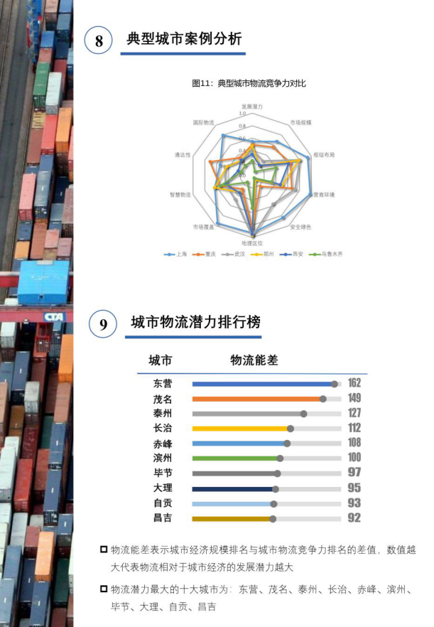 此外,報告在分析了城市的發(fā)展?jié)摿ΑI商環(huán)境、地理區(qū)位、市場覆蓋等多個維度后,梳理出了最具物流潛力的十大城市,分別為東營、茂名、泰州、長治、赤峰、濱州、畢節(jié)、大理、自貢、昌吉。其中不乏西北部內(nèi)陸城市。