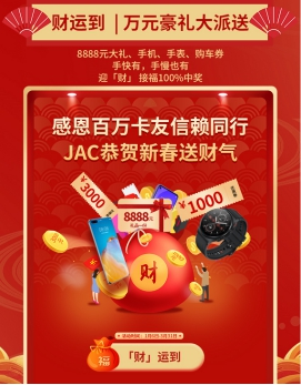 在1月6日至2月26日的賀新春階段,分別有“財運到”“百倍省”“紅包雨直播”三個環節。在“財運到 萬元豪禮大派送”環節中,用戶進入H5頁面進行留資即可參與拆福袋,獎品涵蓋神秘大獎、華為手機、華為手表及千元購車禮券;在“百倍省 折上折樂享不停”環節,登錄江淮輕卡e慧購平臺,最低9.9元購千元購車抵扣券,線下購車可直接使用;而“紅包雨、直播抽獎驚喜多”環節,除了可以搶現金紅包之外,還可參與抽獎,獎品涵蓋保養券及徽州游名額。