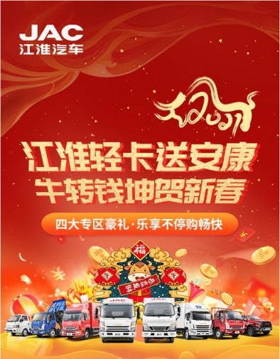 魔幻的2020年已經成為了過去式,在過去的一年里,作為中國中高端輕卡第一品牌的江淮輕卡,年銷量突破21.5萬輛,取得創歷史新高的華麗業績。值此新年之際,為感恩百萬卡友信賴,江淮輕卡于1月6日正式推出“江淮輕卡送安康 「牛」轉「錢」坤賀新春”感恩大回饋活動,萬千豪禮、多重福利重磅來襲,有購車意向的卡友們千萬別錯過!