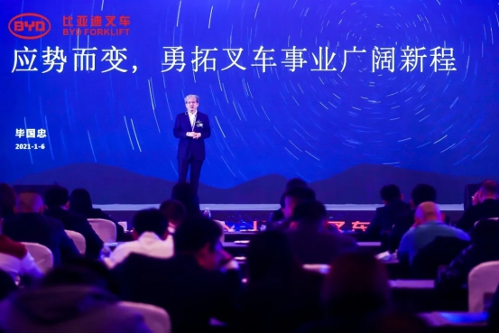 2021年1月6日,以“騁懷致遠,闊境新程”為主題的2020年比亞迪叉車經銷商大會在陜西西安隆重召開,比亞迪叉車總經理畢國忠在會議上正式發布了比亞迪叉車2020年的成績以及2021年的目標。