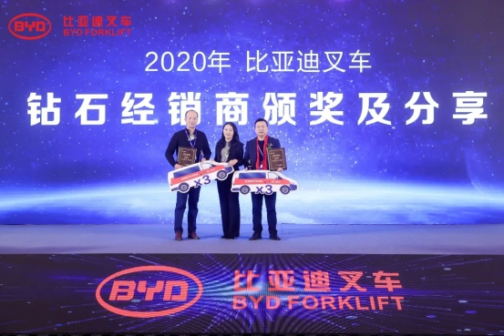 強大的產品離不開龐大的經銷商網絡支持,為感謝全國經銷商多年以來的支持,以及2020年共渡難關的堅守,比亞迪叉車在會上為全國優秀經銷商頒發了頒發了鉆石經銷商獎、非凡營銷獎、卓越經銷商獎等獎項。