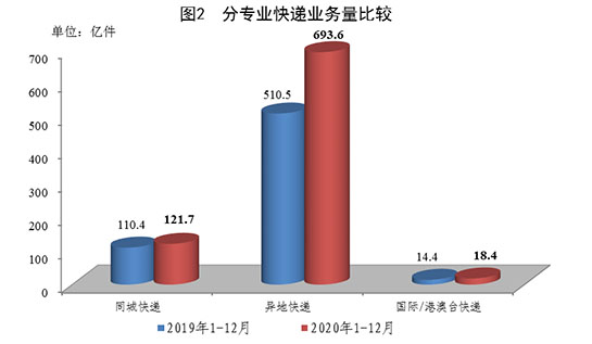 2020年,全國(guó)快遞服務(wù)企業(yè)業(yè)務(wù)量累計(jì)完成833.6億件,同比增長(zhǎng)31.2%;業(yè)務(wù)收入累計(jì)完成8795.4億元,同比增長(zhǎng)17.3%。其中,同城業(yè)務(wù)量累計(jì)完成121.7億件,同比增長(zhǎng)10.2%;異地業(yè)務(wù)量累計(jì)完成693.6億件,同比增長(zhǎng)35.9%;國(guó)際/港澳臺(tái)業(yè)務(wù)量累計(jì)完成18.4億件,同比增長(zhǎng)27.7%。
