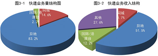 2020年,同城、異地、國(guó)際/港澳臺(tái)快遞業(yè)務(wù)量分別占全部快遞業(yè)務(wù)量的14.6%、83.2%和2.2%;業(yè)務(wù)收入分別占全部快遞收入的8.7%、51.5%和12.2%。與去年同期相比,同城快遞業(yè)務(wù)量的比重下降2.8個(gè)百分點(diǎn),異地快遞業(yè)務(wù)量的比重上升2.8個(gè)百分點(diǎn),國(guó)際/港澳臺(tái)業(yè)務(wù)量的比重基本持平。