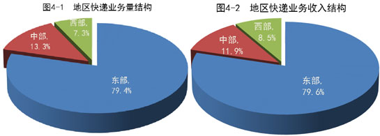 2020年,東、中、西部地區(qū)快遞業(yè)務(wù)量比重分別為79.4%、13.3%和7.3%,業(yè)務(wù)收入比重分別為79.6%、11.9%和8.5%。與去年同期相比,東部地區(qū)快遞業(yè)務(wù)量比重下降0.3個(gè)百分點(diǎn),快遞業(yè)務(wù)收入比重下降0.6個(gè)百分點(diǎn);中部地區(qū)快遞業(yè)務(wù)量比重上升0.4個(gè)百分點(diǎn),快遞業(yè)務(wù)收入比重上升0.6個(gè)百分點(diǎn);西部地區(qū)快遞業(yè)務(wù)量比重下降0.1個(gè)百分點(diǎn),快遞業(yè)務(wù)收入比重基本持平。