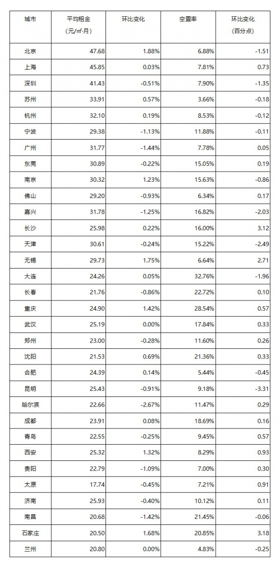 北京、上海、深圳倉庫平均租金仍然領跑全國,均高于40元/㎡·月。相較11月,上海、北京、深圳倉儲市場穩定,倉庫平均租金波動不大。