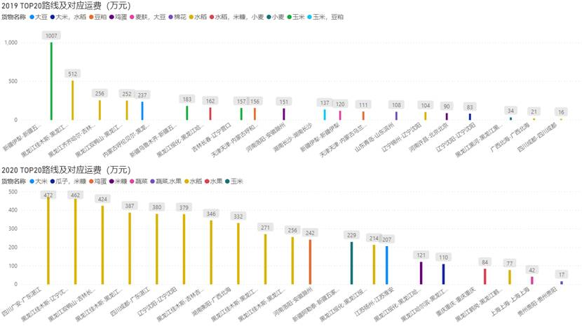 從以上圖表可以看出,在國家重視農業的大背景下,通過路歌大數據體現出,基于19年上半年與20年上半年數據,重要農作物在兩年不同經濟周期中,表現出不同農作物運輸品種和區域線路的變遷。