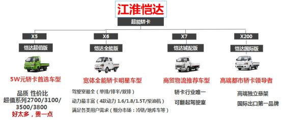 “作為中國中高端轎卡領軍品牌,江淮愷達自誕生之日,便把‘五大超越、五大全能’立為愷達品牌DNA,為此針對每個細分市場研發了高性能的產品和最佳的物流解決方案。在江淮愷達的產品型譜中,包含X5、X6、X7、X200四大產品系。X5定位5萬元級高品質、高性價比首選車型;X6定位同級別寬體全能轎卡明星產品;X7定位商貿物流市場,是轎卡行業內唯一可翻起駕駛室的轎卡車型;X200定位高端都市轎卡領導者,重點布局國際市場。”