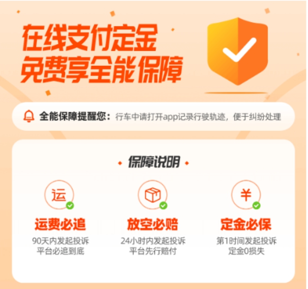 “放空”是貨運行業專有名詞,可通俗理解為司機接貨時“白跑一趟”。“放空必賠”即專門保障因貨主原因導致的車輛放空情況,司機可進行在線申訴,平臺會在定責后按照標準賠付給司機,在提高訂單成交率的同時,保障司機的運輸權益。
