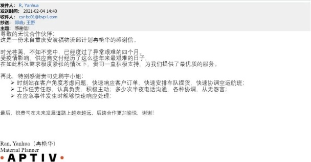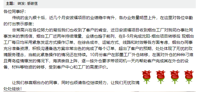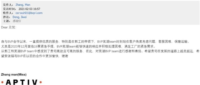 以下是近日來自安波福的感謝信,點名表揚無憂安波福項目運作團隊,尤其是煙臺辦事處、白城辦事處及蕪湖辦事處的安波福運作團隊,無憂為你們點贊!