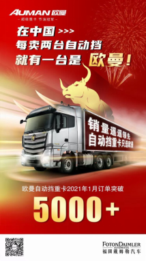 隨著物流行業整合化、規范化、智能化發展與自動擋重卡技術的不斷成熟,自動擋重卡替代手動擋重卡的趨勢成為必然。福田戴姆勒汽車2019年開啟自動擋重卡浪潮,在當年國內自動擋重卡市場銷量8000臺的情況下,歐曼斬獲了6000臺銷量;2020年,歐曼全年銷量超過36000臺,較2019年暴漲500%,市場占比高達55%,2021年1月訂單更是突破5000臺,可以說在中國平均每賣出兩臺自動擋重卡,就有一臺是歐曼。此次,在銷量即將突破5萬臺的里程碑時刻,福田戴姆勒汽車又將采取怎樣舉措夯實領先優勢,值得期待!