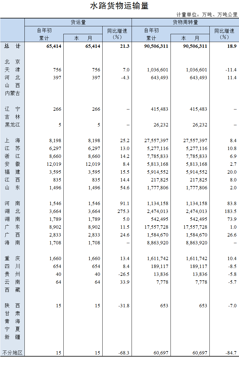 2021年1月水路貨物運(yùn)輸量
