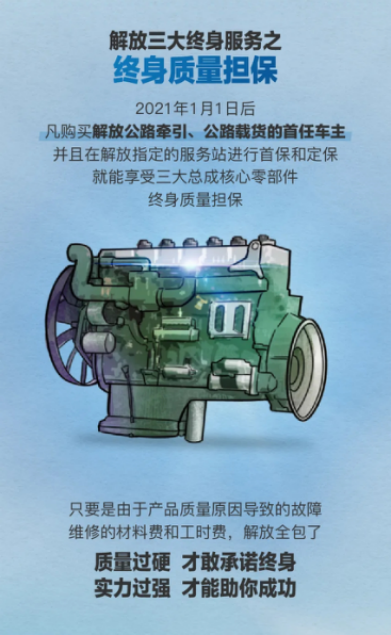 早在2002年,解放即推出“感動服務”,19載風雨同舟,解放品牌與用戶建立深層的信賴,擁有太多感動瞬間,解放堅信服務的本質在于為客戶創造更大價值,并為其提供最佳解決方案。2021年1月1日正式啟動的解放“感動服務”領航計劃,向選擇解放的用戶鏗鏘有力地承諾“三大終身”服務,包括:針對一手的公路牽引車、載貨車、按規定在解放服務站進行定期保養,解放為三大總成核心零部件提供終身的質量擔保;三大總成核心零部件出現人為故障,解放將提供終身免工時費服務;針對解放全系產品車輛在服務站保養發動機,解放將免費終身贈送機油濾芯。