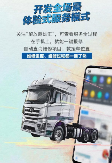 除了銷售的可視化,解放做到的第二可視化是在服務上,叫作“全場景體驗式服務模式”。建立這種模式,解放的初衷就是要在維修的過程中,接待、診斷故障等流程上都做到全程的透明,令用戶、廠家、服務站、4S店都是在同一個交流平臺上。用戶通過關注“解放鷹雄匯”可查看服務全過程,在手機上就能實現一鍵報修、自動查詢維修項目、救援車位置,維修進度和維修過程都一目了然。未來,車輛進站自動識別,自動保修,服務站精準接待,遠程職能診修,車輛健康管理等卡友們期盼的功能也將一一實現。大家在這個平臺中共同成長,期待實現客戶贏、廠家贏、渠道贏的多贏的局面,呈現共融、共享、共建的良好生態。