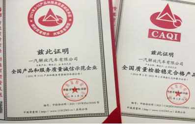 在2021年3.15“產(chǎn)品和服務(wù)質(zhì)量誠(chéng)信承諾”活動(dòng)中,一汽解放斬獲CAQI多項(xiàng)質(zhì)量大獎(jiǎng):一汽解放汽車有限公司被“中國(guó)質(zhì)量檢驗(yàn)協(xié)會(huì)”授予“全國(guó)產(chǎn)品和服務(wù)質(zhì)量誠(chéng)信示范企業(yè)”;于此同時(shí),解放J7、J6系列汽車榮獲CAQI頒發(fā)的“全國(guó)質(zhì)量檢驗(yàn)穩(wěn)定合格產(chǎn)品”證書。這正是一汽解放重視企業(yè)信譽(yù)和產(chǎn)品質(zhì)量的無尚褒獎(jiǎng)及最好體現(xiàn)!