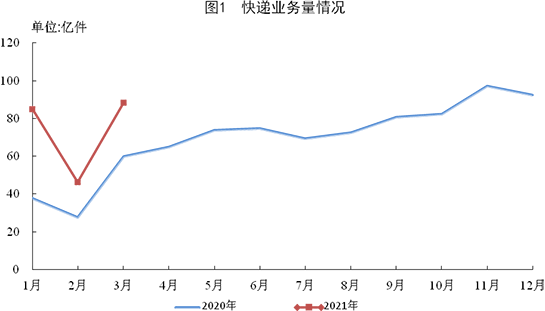 3月份,全國快遞服務企業業務量完成88.2億件,同比增長47.4%;業務收入完成854.4億元,同比增長27.7%。