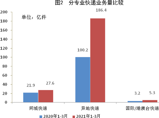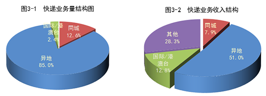 一季度,同城、異地、國際/港澳臺快遞業務量分別占全部快遞業務量的12.6%、85%和2.4%;業務收入分別占全部快遞收入的7.9%、51%和12.8%。與去年同期相比,同城快遞業務量的比重下降4.9個百分點,異地快遞業務量的比重上升5個百分點,國際/港澳臺業務量的比重下降0.1個百分點。