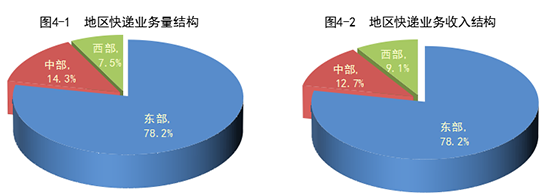 一季度,東、中、西部地區快遞業務量比重分別為78.2%、14.3%和7.5%,業務收入比重分別為78.2%、12.7%和9.1%。與去年同期相比,東部地區快遞業務量比重下降1.6個百分點,快遞業務收入比重下降1.5個百分點;中部地區快遞業務量比重上升2.2個百分點,快遞業務收入比重上升1.6個百分點;西部地區快遞業務量比重下降0.6個百分點,快遞業務收入比重下降0.1個百分點。