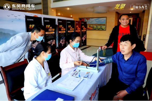 ▲東風(fēng)商用車幸福卡車關(guān)愛(ài)計(jì)劃聘請(qǐng)的美連大健康醫(yī)護(hù)人員在活動(dòng)現(xiàn)場(chǎng)給卡友做體檢