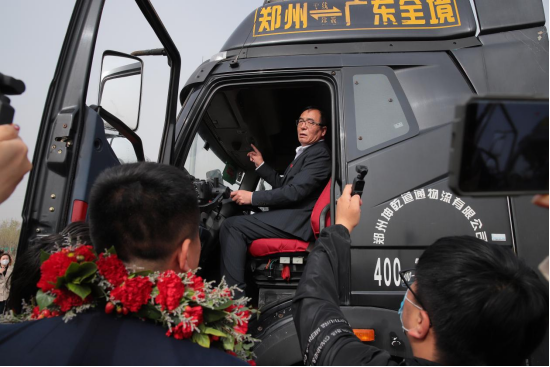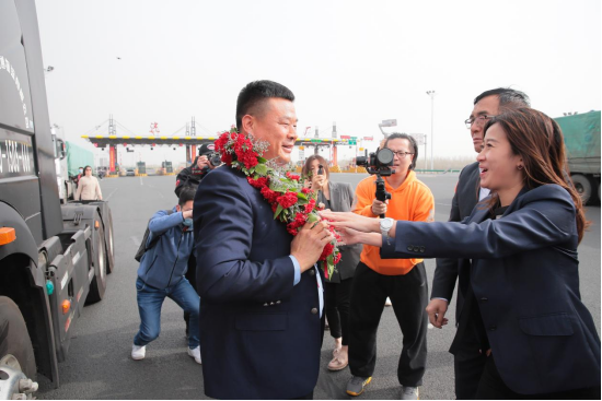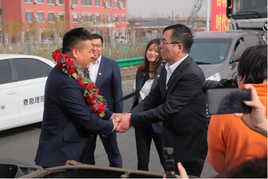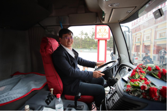 陽光下,黝黑的車身彰顯著成熟與穩重,不負使命,光榮完成這次意義非凡的任務;金色的“鷹標”熠熠生輝,閃耀著榮耀與自豪。一汽解放總經理助理、銷售公司總經理、黨委書記王志才迎上與耿開學握手,一汽解放汽車銷售有限公司客戶開發維護部部長王睿獻上花環。