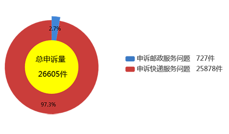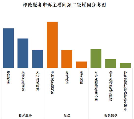郵政服務申訴的主要問題是投遞服務、郵件延誤和郵件丟失短少,分別占申訴總量的42.8%、26.4%和20.2%。其中,環比、同比均增長明顯的是投遞服務問題。