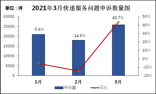 用戶對快遞服務問題申訴25878件,環比增長43.7%,同比增長65.4%。
