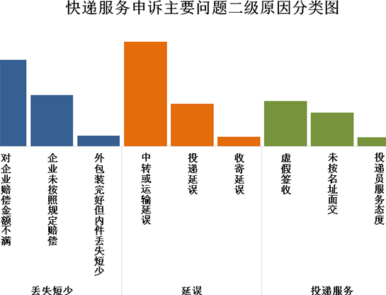 快件丟失短少申訴中主要占比是對企業賠償金額不滿,快件延誤申訴中主要占比是中轉或運輸延誤,投遞服務申訴中主要占比是虛假簽收。