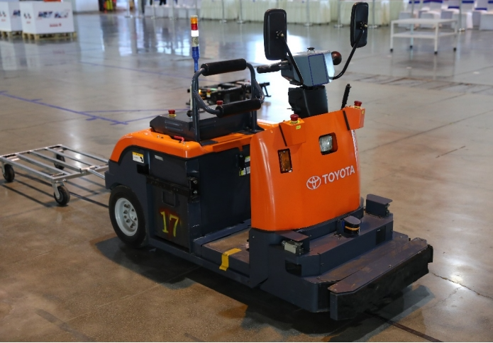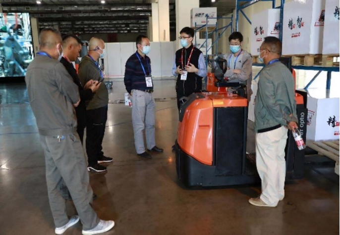TOYOTA 4CBTYR電動遙控牽引車,可在人工駕駛和遙控駕駛間進行切換,可應用于點對點配給以及多點混載配給,現場駕駛人員演示了人工駕駛和遙控器操控兩種模式的切換。