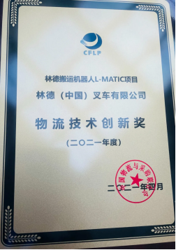 會議上,經(jīng)過專家評審委員會的認真審核,林德搬運機器人L-MATIC多項核心指標處于行業(yè)的前列,榮獲“物流技術(shù)創(chuàng)新獎”。