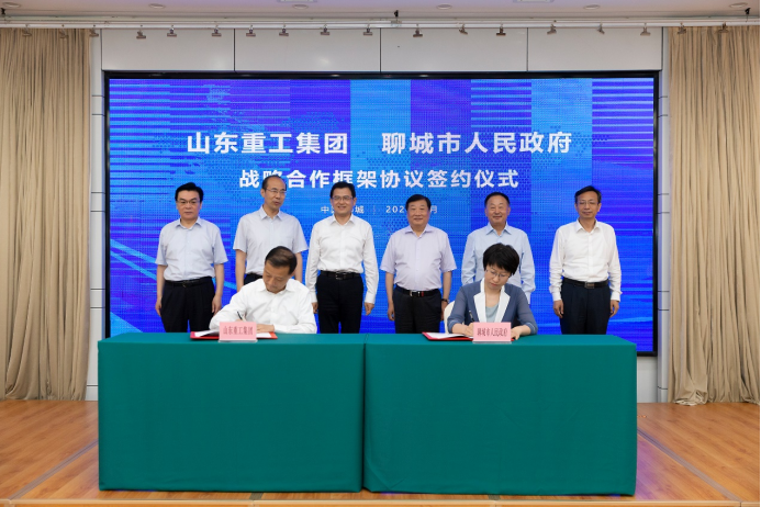 6月4日下午,山東重工集團與聊城市人民政府戰略合作框架協議簽約儀式在山東聊城舉行。聊城市委書記孫愛軍、市長李長萍,山東重工集團黨委書記、董事長譚旭光,魯信集團黨委書記、董事長李瑋出席簽約儀式。