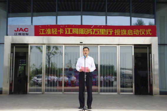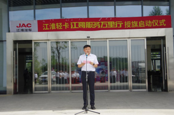 輕型商用車營銷公司總經理助理萬鋒為“江哥服務萬里行”活動授旗