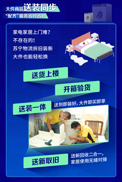 送前電聯、送貨上門一直是蘇寧物流末端服務的“規范動作”,針對訂單量持續暴增的家電、家居、健身器材等大件品類,除基本服務之外,蘇寧物流還為用戶提供“送裝一體”、“送新取舊”服務,新家電、新家居等送貨上門的同時,蘇寧物流大件配送員還負責安裝、拆舊、回收舊物等,目前這兩項服務已覆蓋全國300+城市。