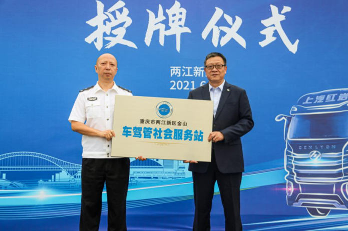 活動現場,重慶兩江新區公安分局副局長李強向上汽紅巖總經理樓建平正式授牌。