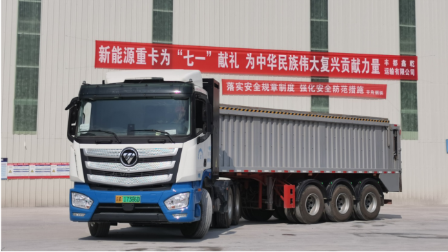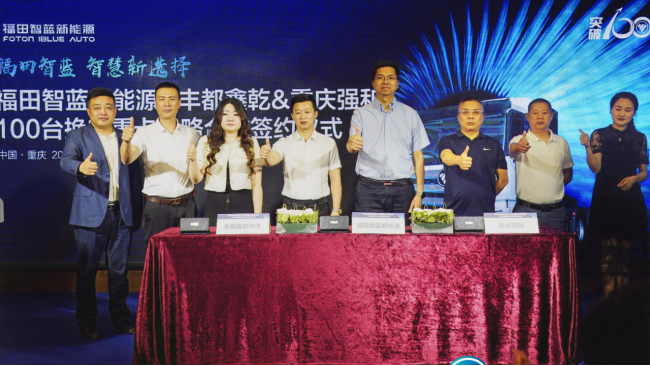 2021年6月24日,福田智藍(lán)新能源與豐都鑫乾物流運(yùn)輸公司簽訂100臺(tái)換電重卡采購(gòu)合同,即日起分批交付,雙方共創(chuàng)全國(guó)換電重卡落地運(yùn)營(yíng)第一大單,向建黨100周年獻(xiàn)禮!