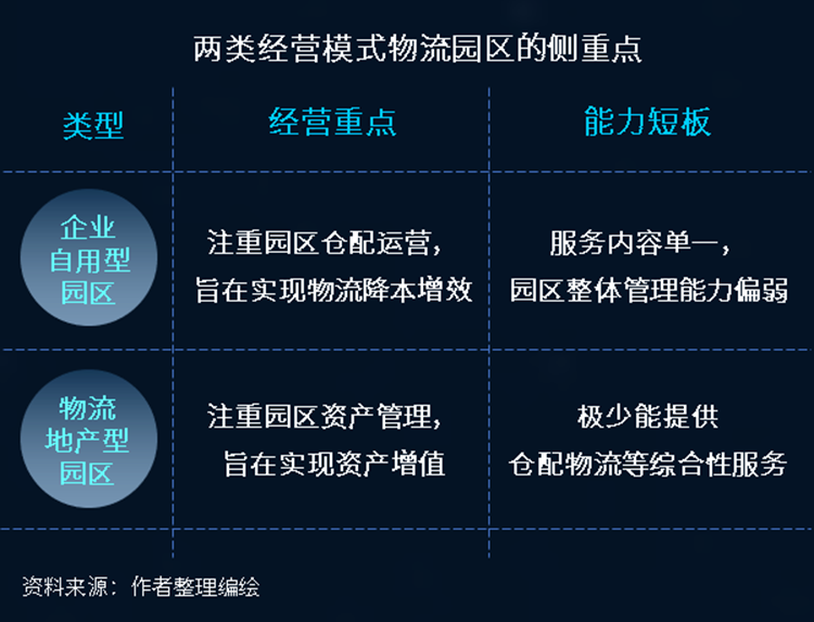 從物流園區的市場格局來看,物流園區因經營模式各有不同,在發展過程中形成了兩種類型的物流園區,其能力側重點各有不同。