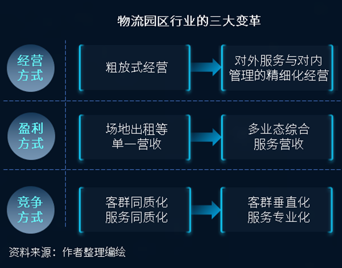 得益于我國經濟總量的穩步提升,物流園區數量穩步增加。然而,伴隨我國經濟深入換擋升級,物流園區由單純的數量增長邁向質量提高與結構調整的方向變革。物流園區正在由粗放式、同質化的階段,加速進入精細化、專業化的發展階段,正在經歷以下三大變革: