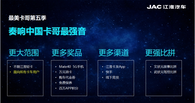 砥礪前行又一載,繼往開來啟新程。在第五季最美卡哥評選活動中,卡哥們不僅能夠得到實實在在的大獎,優勝卡哥還將邁向更大的舞臺,有機會簽約江淮輕卡獨家網紅,成為最美輕卡一哥,或者直接被推薦參加中國交通運輸協會、中國職工發展基金會等協會組織的卡車人春晚。