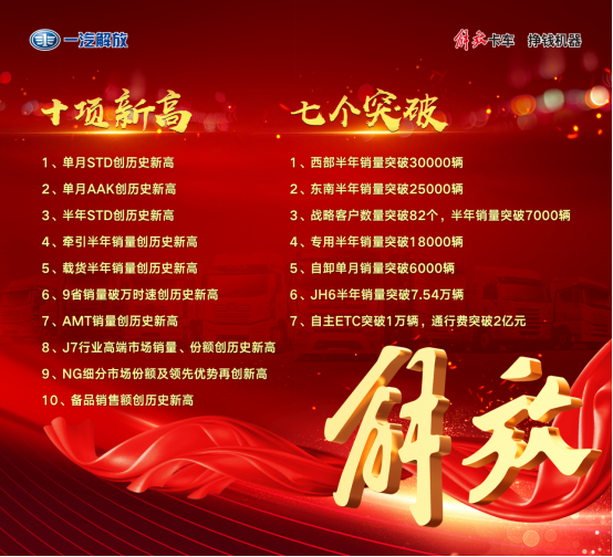 在上半年的大戰(zhàn)大考中,解放肩承領軍者使命,敢戰(zhàn)能勝,刺刀見紅,整車銷量34萬輛,同比增長近20%;其中,中重卡實現(xiàn)銷量近30萬輛,同比增長約25%,市場份額近26%,較2020年提升約4個百分點,行業(yè)絕對領先。值得一提的是,解放半年、單月銷量均創(chuàng)造歷史新高,9省銷量破萬時速創(chuàng)歷史新高,J7高端市場份額、NG市場份額、備品半年銷售額均以創(chuàng)新高的表現(xiàn)領跑行業(yè)。此外,解放在西部、東南、要客、專用、自卸、JH6、ETC業(yè)務推廣七個領域實現(xiàn)突破,其中西部戰(zhàn)區(qū)半年銷量突破30000輛、東南戰(zhàn)區(qū)半年銷量突破25000輛,專用車半年銷量突破18000輛,自卸單月銷量突破6000輛;戰(zhàn)略客戶數(shù)量突破82個,半年銷量破7000輛;JH6半年銷量突破7.54萬輛,自主ETC發(fā)行量突破1萬輛,通行費突破2億元。上半年,解放創(chuàng)造十項新高、實現(xiàn)七個突破,以領航之勢勇立行業(yè)潮頭,繼續(xù)抒寫著解放自主事業(yè)的璀璨華章。