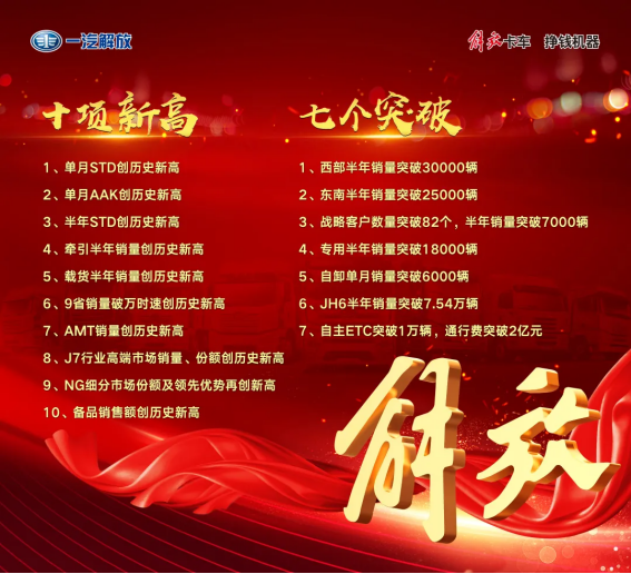 此外,解放在西部、東南、要客、專用、自卸、JH6、ETC業務推廣七個領域實現突破,其中西部戰區半年銷量突破30000輛、東南戰區半年銷量突破25000輛,專用車半年銷量突破18000輛,自卸單月銷量突破6000輛;戰略客戶數量突破82個,半年銷量破7000輛;JH6半年銷量突破7.54萬輛,自主ETC發行量突破1萬輛,通行費突破2億元。上半年,解放創造十項新高、實現七個突破,以領航之勢勇立行業潮頭,繼續抒寫著解放自主事業的璀璨華章。
