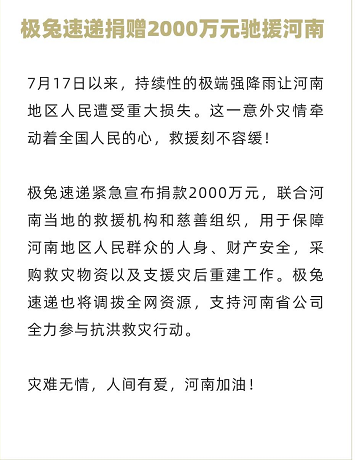 7月21日,極兔速遞緊急宣布捐款2000萬元,聯合河南當地的救援機構和慈善組織,用于保障河南地區人民群眾的人身、財產安全,采購救災物資以及支援災后重建工作。極兔速遞也將調撥全網資源,支持河南省公司全力參與抗洪救災行動。