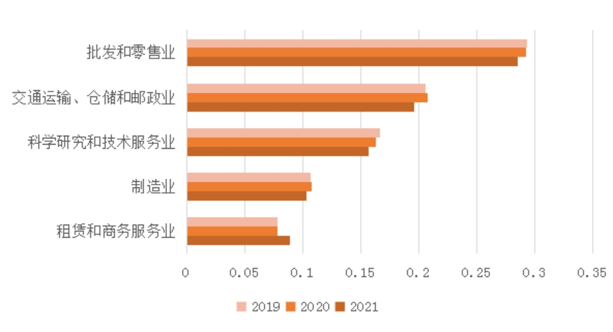 《報告》通過京東企業(yè)購大數(shù)據(jù)發(fā)現(xiàn),服務(wù)行業(yè)中小企業(yè)的采購數(shù)字化水平相較其他行業(yè)更高。從成交金額看,批發(fā)和零售業(yè)、科學(xué)研究和技術(shù)服務(wù)業(yè)、交通運輸、倉儲和郵政、制造業(yè)以及租賃和商務(wù)服務(wù)業(yè)是線上采購金額最多的五大行業(yè)。其中,批發(fā)和零售業(yè)的成交金額占到了總成交金額的約30%。與活躍用戶數(shù)占比情況類似,主要行業(yè)的中小企業(yè)的成交額占比整體較為穩(wěn)定。