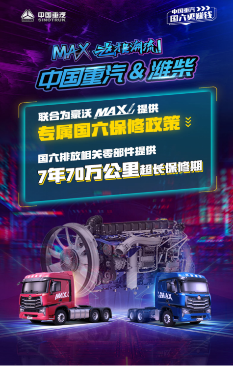 除了出色的顏值和霸氣外觀,HOWO MAX在動力、安全、智能和節油方面也進行了全面升級。更值得一提的是,中國重汽與濰柴聯合為MAX提供專屬國六保修政策,為國六排放相關零部件提供7年70萬公里超長保修。再添有力保障,保證用車無憂,網友紛紛驚嘆——這就是我想要的創富神車!