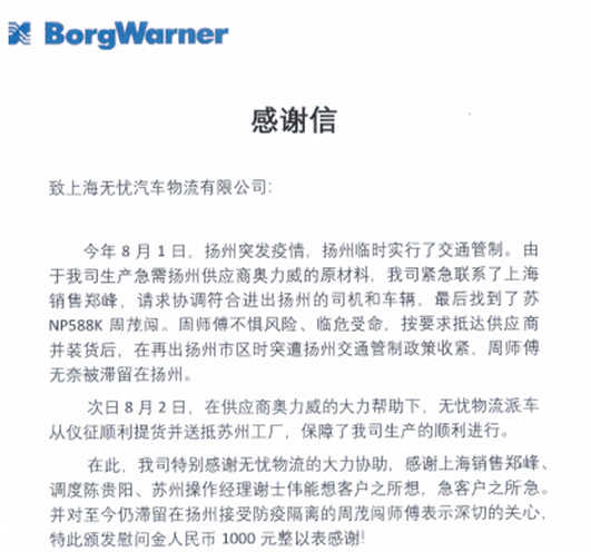 2# 8月初,揚州突發疫情,我們的客戶德爾福科技(蘇州)有限公司(現博格華納)急需符合進出揚州通行條件的司機和車輛前往揚州供應商處提貨。接到指令后,無憂的服務團隊時刻關注當地防疫政策變化,與客戶及原材料供應商積極溝通,最終采取通過有通行證的車輛,將貨物送至低風險的揚州下級縣城,無憂派車接應的方案。方案確定后,無憂運營團隊高效響應,安排車輛無縫對接,將貨物順利送至德爾福蘇州工廠,保障了客戶工廠產線的順利運行。對于無憂團隊想客戶之所想,急客戶之所急的高效服務,為表達對我們工作的肯定和感謝,德爾福科技公司向無憂發出了誠摯的感謝。