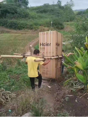 為防止車廂里的冰箱磕到,李柳強緩慢前進,公路并未直通村莊,距離顧客家還有好幾里很窄的泥土路,車子進不去,只能聯系村民一起扛起冰箱往里走。