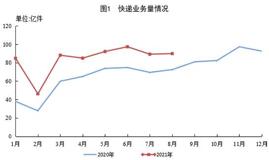 8月份,全國快遞服務(wù)企業(yè)業(yè)務(wù)量完成89.9億件,同比增長24.3%;業(yè)務(wù)收入完成840.1億元,同比增長15.5%。