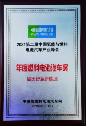 2021年9月15日,第二屆中國氫能與燃料電池汽車產業峰會上,福田智藍新能源榮獲2021年度氫燃料電池汽車品牌獎,這代表著行業內對福田智藍新能源在氫燃料領域技術創新、產業鏈融合、產品商業化運營的高度認可。