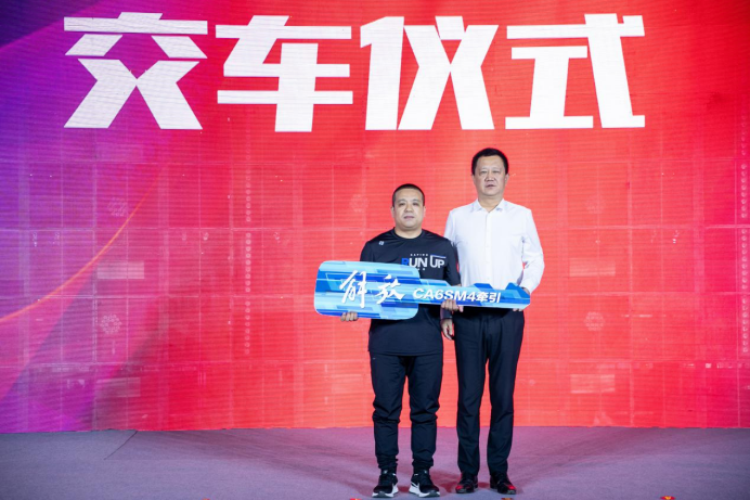 一汽解放發(fā)動(dòng)機(jī)事業(yè)部副總經(jīng)理黃南翔向用戶朋友交付代表財(cái)富的車鑰匙