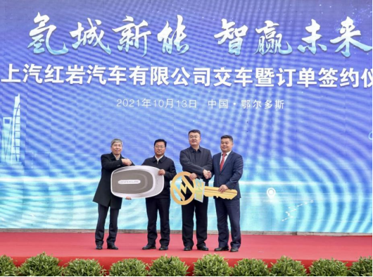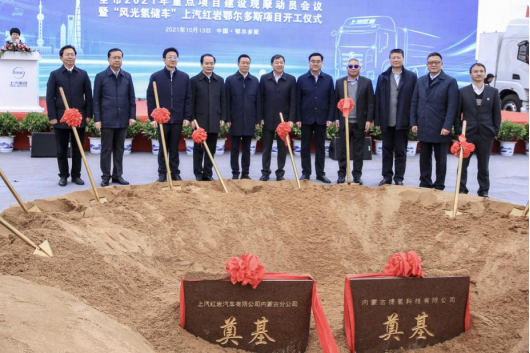 2021年10月13日,上汽紅巖汽車(chē)有限公司內(nèi)蒙古分公司與內(nèi)蒙古捷氫科技有限公司揭牌暨奠基儀式在內(nèi)蒙古鄂爾多斯市隆重舉行,標(biāo)志著全球首個(gè)萬(wàn)輛級(jí)氫能重卡產(chǎn)業(yè)鏈項(xiàng)目正式啟動(dòng)。內(nèi)蒙古鄂爾多斯市委書(shū)記李理,市委副書(shū)記、代市長(zhǎng)杜匯良等市領(lǐng)導(dǎo)以及伊金霍洛旗等各旗區(qū)領(lǐng)導(dǎo),上汽集團(tuán)副總裁藍(lán)青松,上汽集團(tuán)副總裁、總工程師祖似杰等領(lǐng)導(dǎo)以及上汽紅巖、捷氫科技相關(guān)領(lǐng)導(dǎo),及客戶(hù)、經(jīng)銷(xiāo)商、媒體代表等200余人出席活動(dòng),共同見(jiàn)證助力打造“北疆綠氫城”的歷史時(shí)刻。