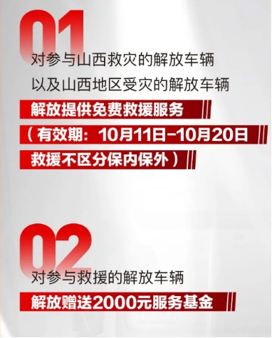 一、對參與山西救災的解放車輛以及山西地區受災的解放車輛,在10月11日-10月20日期間,解放山西省內服務站將提供免費救援服務(救援不區分保內保外)。注意提前向呼叫中心報備,保內業務按正常流程申報。