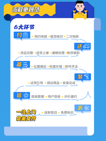當(dāng)下,消費(fèi)者對服務(wù)體驗(yàn)要求提升,如何提升時效、降低破損,做到送裝一體,成為行業(yè)、品牌需要面對的服務(wù)命題。雙十一期間,蘇寧易購對外發(fā)布“219”家裝物流服務(wù)標(biāo)準(zhǔn),即“2次電聯(lián)1次上門9大服務(wù)”,在消費(fèi)者完成下單購買產(chǎn)品之后,蘇寧易購啟動送裝一體服務(wù)流程,貨到預(yù)約和上門前電話聯(lián)系各1次,預(yù)約、上樓、檢查、安裝、調(diào)試、試用、拆舊、清掃、取舊九大服務(wù)一步到位。