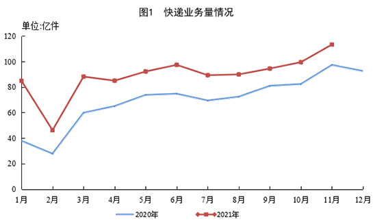 11月份,全國快遞服務企業業務量完成113.3億件,同比增長16.5%;業務收入完成1074.9億元,同比增長12.0%。